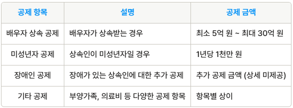 • 기본적으로 배우자 공제, 일괄 공제, 금융재산 공제 등이 적용됩니다.